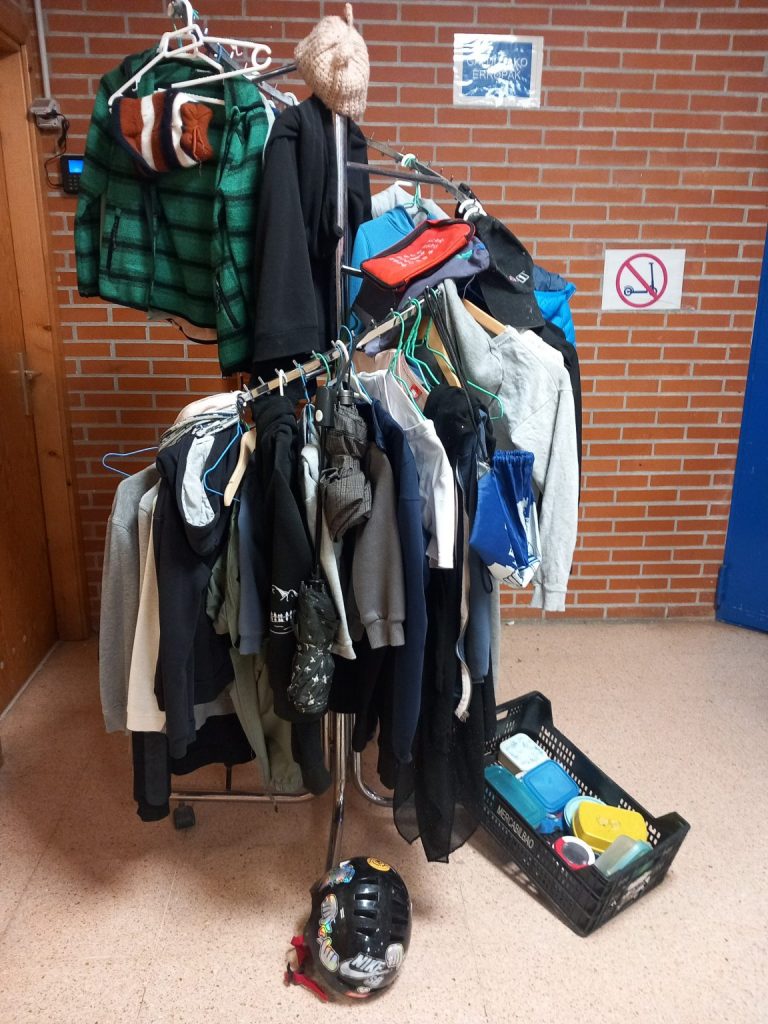 Ikastolako sarreran biltzen diren arropak eta objektuak pilatzen joaten dira, eta jaberik gabe irauten dute nahi baino gehiago.